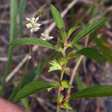 Annual; stem erect, simple or branched, 20-50 cm, pubescent with incurved hairs; petioles usually shorter than the bracts; blades nearly linear to oblong or narrowly elliptic, 2-5 cm, obscurely crenate to entire; pistillate bracts typically arcuate-recurved, 5-10 mm, shallowly lobed into 9-15 deltoid or ovate, typically glandular segments; staminate spike mostly 5-15 mm, usually exceeding the bracts; seeds 3(1).