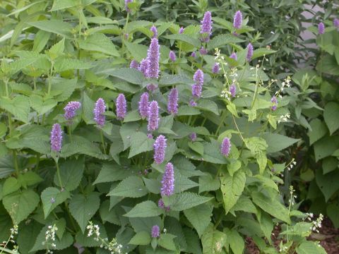 Herbaceous perennial; stems erect, to 1 m, simple or branched above; leaves ovate to rhombic ovate or deltoid ovate, to 9 cm, coarsely serrate, broadly obtuse to truncate at the base, whitish on the underside with very fine close pubescence; petioles rarely to 1.5 cm; spikes cylindric, to 15 cm, 2-2.5 diameter, often interrupted at the base; bracts broadly ovate, acuminate; calyx puberulent at anthesis, 5-7 mm, the lobes blue at least distally, lance-triangular, 1.5-2 mm; corolla blue-purple, nearly 1 cm.