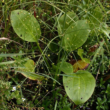 Herbaceous perennial from a 1-2 cm thick rhizome; leaves usually long-petiolate, the blade elliptic to broadly ovate, rounded to subcordate at the base, 3-18 cm long and 1.5-2.5 times as long as wide; scape 10-100 cm; pedicels in whorls of 3-10; sepals obtuse, 2-3 mm; petals white, 3.8-4.5 mm long, 1.5 times as long as the sepals; style short, 0.4-0.6 mm, the stigmatic portion more or less curved; achenes 15-23, 1.8-3.0 mm, usually with a median dorsal groove, rarely with 2 grooves.