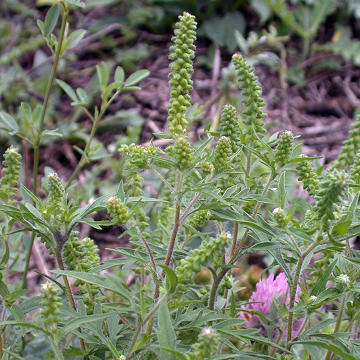 The common name of this plant is well-known to allergy sufferers. Some people think of goldenrods as ragweed, presumably because they assume bright flowers seen in the fall are the source of drifting pollen. However, plants with wind-disseminated pollen typically do not have brightly colored flowers.