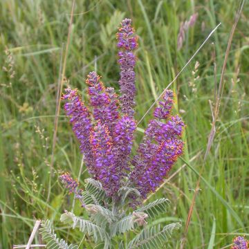 Woody shrub to 1 m high. Leaves nearly sessile, pinnately compound, 14 to 20 pairs of leaflets up to 1.5 cm long. Flowers in spike-like racemes, clustered in groups of 5 to 20, the terminal raceme longer than the laterals; Flowers deep purple; stamens 10, exceeding the petals.