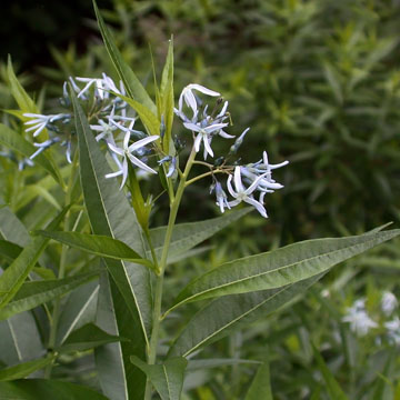 Herbaceous perennial; stems erect, 40-100 cm; leaves thin, dull, narrowly lanceolate to ovate or broadly elliptic, 8-15 cm, acuminate, finely hairy or glabrous beneath; cymes flat to pyramidal, many flowered; calyx glabrous; corolla tube 6-10 mm, villous, especially distally; corolla limb 1 cm wide; fruit cylindric, erect, 8-12 cm.