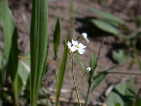 Biennial or perennial, 30-40 cm. Basal leaves spatulate, 2-4 cm, entire to pinnately lobed; cauline leaves narrow. Flowers white, pedicels spreading to ascending, petals 4.