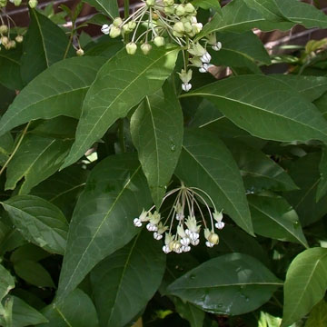 Herbaceous perennial; stems 80-150 cm, glabrous or puberulent in narrow lines; leaves thin, broadly elliptic, 10-20 cm, acuminate at both ends, glabrous, or puberulent on the underside; petioles 1-2 cm; umbels loosely few-flowered, pedicels slender and spreading or drooping; corolla white to pale purple, the lobes 7-10 mm; hoods white or pink, 4 mm, about equaling the gynostegium, the lateral margins adjacent, each terminating in an erect tooth 1-1.5 mm, the rest of the hood truncate (tubular); horns subulate, suberect, exsert; fruit erect on deflexed pedicels, puberulent, 12-15 cm.