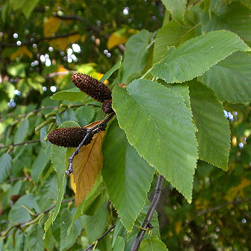 Deciduous tree to 25 m tall; bark smooth, red-brown when young with prominent lenticels, becoming rough with large, thickened, plates on large specimens. Leaves ovate or ovate-oblong, to 10 cm, acute or short-acuminate, very finely and sharply serrate, rounded to subcordate at the base, appressed-villous on the veins below, often in pairs on spur branches; lateral veins in 9-12 pairs, impressed above. Fruiting catkins sessile or subsessile, short-cylindric to ellipsoid or slightly obovoid, to 3 cm; scales glabrous, to 5-7 mm long, the middle lobe somewhat prolonged, and the lateral lobes oblong and divergent or ascending.