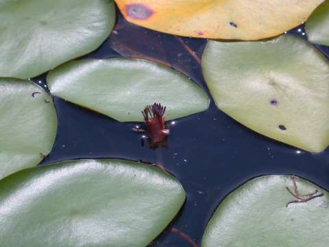 Elliptic floating leaves attached in the middle to submerged stems to 2 m. Lower surface of leaf and stem covered in a clear and extremely slippery coating. Flowers dull purple-red on stout peduncles to 15 cm; sepals and petals persistent; petals 12-16 mm, the sepals somewhat shorter; stamens 12-18 or up to 36; filament of 2 lengths; pistils 4-8.