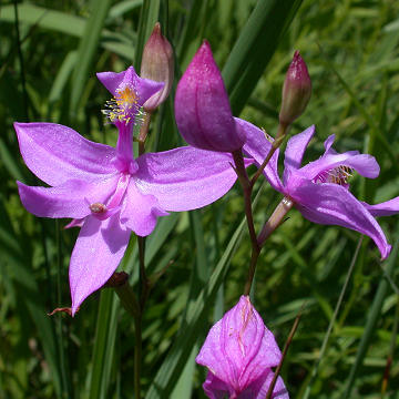 Perennial monocot from a corm. Leaf solitary, linear, to 50 cm x 4 cm, long-sheathing; flowers 3-15 in a loose raceme borne on a scape 30-70 cm long; tepals magenta, 15-25 mm, acute; lip 15-20 mm with a narrow base and a broadly flabellate summit, crested above with stout hairs tipped with magenta and yellow; winged terminal portion of the column suborbicular, with a tapering base.