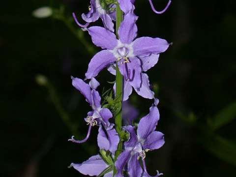 Winter-annual or biennial with milky sap; stems erect, often branching, to 2 m. Leaves alternate, thin, serrate, lanceolate, acuminate, tapered at base, 7-15 cm including petiole. Flowers blue, in elongate terminal spikes; corolla rotate, 2.5 cm wide; sepals linear, spreading, 5-10 mm; style curved downward with an upcurved tip.