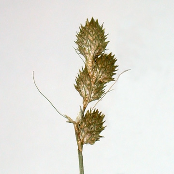Tufted perennial; stems 30-100 cm, aphyllopodic; main leaves 2-4 mm wide, shorter than the stems, the sheaths ventrally green-veined almost to the summit, with only a short hyaline area; spikes 4-8, gynaecandrous, silvery-green to silvery-brown, subglobose to ovoid, 8-13 mm, obtuse at the base with few staminate flowers, sessile and closely aggregated in an erect cluster 2-4 cm; pistillate scales shorter than the perigynia, ovate or lance-ovate, nearly hyaline with a slender green center, short-aristate; perigynia flat, 3.7-4.9 mm long and 2.8-3.5 mm wide, 1.25-1.7 times as long as wide, several-nerved on both faces, broadest near or slightly above the middle, broadly rounded to the narrow beak less than half as long as the obovate body; achene lenticular, 1.5-2 mm long and about 1 mm wide.