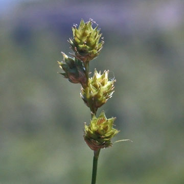 Tufted perennial, 20-100 cm, aphyllopodic; leaves firm, 2-4 mm wide, much shorter than stems; spikes mostly 3-6, gynaecandrous, stout, sessile, greenish-stramineous to light brown; bracts inconspicuous, shorter than the inflorescence; pistillate scales hyaline-scarious, with a firmer, often greenish midrib, narrower and tending to be shorter than the perigynia; perigynia crowded, stiffly ascending, 3.2-4.8 mm long, 1.3-1.7 times as long as wide, the body flattened, suborbicular, nearly nerveless ventrally, wing-margined all around and serrulate distally, abruptly contracted to the flattened, serrulate beak 0.8-1.5 mm; achene lenticular.