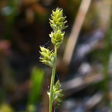 A similar species, C. brunnescens, has fewer perigynia per spike (mostly 5-10, up to 15) lacking ventral nerves or the ventral nerves obscure. In C. brunnescens the perigynia tend to be more spreading and therefore they more noticeably interrupt the outline of the spike than they do in C. canescens.