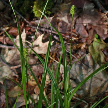 Tufted perennial, 30-60 cm; stems weakly scabrous above, slightly shorter to more than twice as long the leaves; leaves 2-5 mm wide; spikes in a dense ovoid head 1-2 cm, subglobose, 5 mm, androgynous; bracts setaceous; perigynia greenish or somewhat stramineous, spreading, ovate, planoconvex, 2.5-3.5 mm, rounded or cuneate at the base, conspicuously serrulate distally, the beak a third as long as the body and sharply bidentate; pistillate scales broadly ovate, hyaline at the margin, green along the center, with green midvein and two obscure lateral veins, acuminate to short-awned, the body much shorter than and mostly concealed by the perigynia.