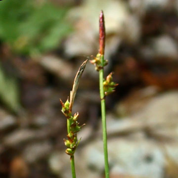 Tufted perennial, 20-50 cm, smooth and purplish at the base; stems equaling or surpassing the leaves; main leaves 3-6 mm wide; terminal spike staminate, 4-18 mm; pistillate spikes 2 or 3, more or less sessile, 5-10 mm, the lowest a little removed from the others, but none basal; middle and lower bracts mostly green, but tending to be scarious-lobed at the base; pistillate scales lance-ovate, about as long as the perigynia, obtuse to acuminate, reddish-purple with green, 3-nerved center and narrow hylaine margins; perigynia 3-10, 2.5-4 mm, the body subglobose above a stipe-like base, 2-keeled, finely hairy, abruptly prolonged into a slender beak 0.5-1 mm; achene rounded-trigonous.