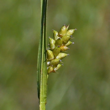 Tufted perennial, 10-70 cm; stems usually much surpassing the leaves; main leaves 2-4 mm wide; peduncles and axis of inflorescence scabrous; terminal spike staminate, 1-2 cm, linear, long-peduncled, usually much surpassing the uppermost pistillate spike; pistillate spikes 2-4, widely separate or the upper two contiguous, short-cylindric, 1-2 cm, on short and rough peduncles; bracts foliaceous, the margins of the sheaths rough; pistillate scales ovate, much shorter than the perigynia, the midvein green and usually excurrent into a short and very rough awn; perigynia ellipsoid, 2.5-3.8 mm, beakless, with numerous impressed nerves; achene concavely trigonous.
