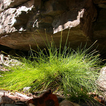Densely tufted with long, slender rhizomes; stems thin, to 30 cm. Leaves shorter than stems, involute, to 0.5 mm; spikes subtended by short bladeless sheaths; pistillate spikes 2-3, 3-6 mm long, 2-6 flowered, on long erect peduncles exceeding the terminal staminate spikes; bracts of pistillate spikes bladeless, consisting of sheath only; pistillate scales ovate, shorter than perigynia, pale with a narrow green midvein; perigynium beakless, starting green and becoming dark brown, 1.5-2 mm, few-nerved, smooth, filled by the achene, with a conic beak 0.2 mm; staminate spike sessile; leaf blades under 2 mm wide, perigynia 1.5-2 mm, beakless; achene trigonous; stigmas 3; style deciduous.