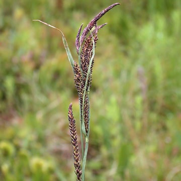 Rhizomatous perennial; stems slender, arising laterally, scabrous on the angles, 40-120 cm; lowest leaves reduced to reddish brown, bladeless sheaths; main leaves 3.5-6(-8) mm wide; sheaths glabrous, reddish dorsally, tawny and generally convex at the apex; lowest bract leaf-like, about equaling the inflorescence, the other reduced; staminate spikes 1-3, usually 2, 1.5-5 cm; pistillate spikes 3-5, short-pedunculate or sessile, erect, 2-10 cm, slender, tapering at the base, the uppermost with some distal staminate flowers; pistillate scales with a broad green or tawny midstrip and a submarginal tawny to reddish-brown band, usually narrower and shorter than the perigynia; perigynia 1.7-3.2 mm, green to stramineous, not dotted, flattened and planoconvex, usually several-nerved on each side, short-beaked; achene lenticular.