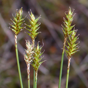 Tufted perennial; stems smooth, stiff, 20-70 cm, usually surpassing the leaves; leaves slender, involute; spike usually solitary, 0.8-2.5(-4) cm, gynaecandrous or unisexual; lateral spikes 1-2 and much smaller, if present; lower 2 scales empty and erect; anthers 2-3.5 mm; pistillate scales ovate, about equaling the body of the perigynium, usually acute, red-brown with hyaline margins; perigynia 2.6-4.7 mm long, at least the lower ones spreading or reflexed, brownish, planoconvex, ovate, spongy-thickened at the base, with up to 15 faint nerves dorsally and up to 7 ventrally, the beak serrulate-margined and 1/5 to 2/3 as long as the body; achene lenticular.