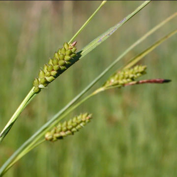 Tufted perennial on very short rhizomes; stems 30-80 cm; main leaves mostly 4-10 mm wide, often surpassing the culms; terminal spike staminate, sessile or nearly so, barely surpassing the uppermost pistillate spike and much exceeded by the bracts; pistillate spikes short-cylindric, 1-3 cm long, the lower on long-exserted (but not basal) peduncles, the upper short-peduncled or subsessile, the upper 1 or 2 contiguous to the staminate spike; pistillate scales triangular-ovate, half to fully as long as the perigynium, acute or cuspidate; perigynia crowded in several rows, ellipsoid to obovoid, 2.2-4 mm long, sharply many-nerved, abruptly contracted to a short, straight, or abruptly outcurved beak; achene concavely trigonous, loosely enveloped.