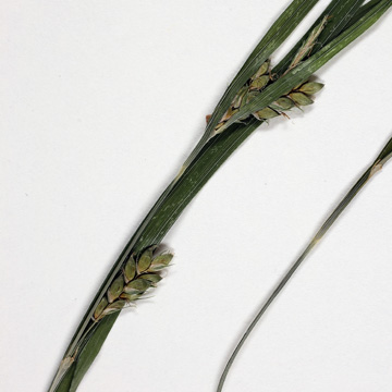 Tufted perennial; stems 20-90 cm; basal sheaths red-purple to rarely brown; leaves (3.7-)4.2-8.2(-9.1) mm wide; peduncles and axis of inflorescence mostly smooth; terminal spike staminate, sessile or nearly so, usually surpassing the uppermost pistillate one; pistillate spikes 2-4, 5-31 mm long, loosely flowered with 3-19 mostly widely spaced perigynia, the lowest near the middle of the stem on exsert peduncles, the upper on shorter peduncles; pistillate scales ovate, 4-8.2 mm long, entire, white-margined and often with red-brown speckles, the mid vein of the lower prolonged into an awn 0.9-5.3 mm; perigynia spirally imbricate, ellipsoid to obovoid, rounded to quite obtusely trigonous in cross section, 4.2-5.3 mm long and (1.8-)2-2.6 mm wide, gradually tapered to the base and apex, finely many-nerved, with a straight beak to 0.2 mm or beakless; achenes trigonous, broadly obovoid to obovoid.