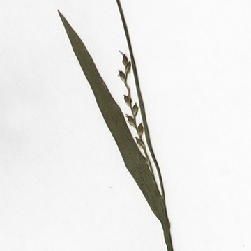 Carex striatula is similar but with larger perigynia (3.4-5 mm long) that taper evenly at both ends; the perigynia of C. laxiflora taper more gradually at the base than to the beak at the apex.