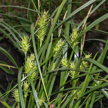 Perennial to 1.3 m from long, dark, scaly, rhizomes; stems smooth, solitary or few; basal sheaths persistent, reddish to brownish; leaves septate-nodulose, to 1.5 cm wide, the uppermost (excluding bracts) with a sheath 1.5-2.5 cm; spikelets cylindric, pedunculate; staminate spikelets single, terminal, to 8.5 cm long; perigynia more than 1 cm long, lance-ovate; stigmas 3; style persistent; achenes trigonous, typically longer than broad.