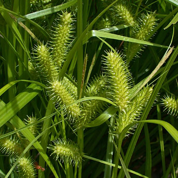 A very common species, particularly in disturbed areas of moist woods. Also called Bottlebrush Sedge, but there are other sedges given this name (C. comosa and C. hystericina). The latter is similar but has at least the lowest pistillate spike spreading or drooping on a slender peduncle. Carex baileyi looks very much like C. lurida but has narrower leaves and longer, more abruptly beaked perigynia.