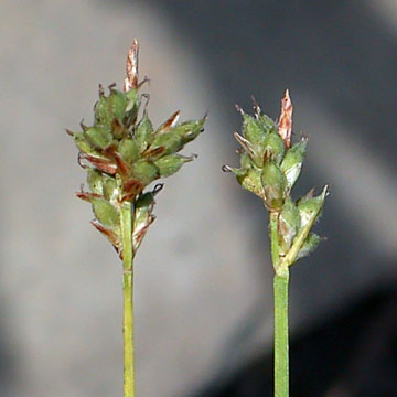 Loosely tufted perennial; stems slender, erect, 20-60 cm, typically much surpassing the leaves; leaves 1-1.5 mm wide; inflorescence 1-2 cm with a small terminal staminate spike and 2-3 closely crowded pistillate ones; pistillate scales reddish-brown with a broad hyaline margin and pale center, wider but shorter than the perigynia, blunt or rounded, sometimes shortly mucronate; perigynia 3-12, dull- to yellowish-green, short-hairy, 2.7-4.1 mm, slightly flattened, narrowly obovoid above a stipe-like base, 2-keeled, abruptly contracted to a slender beak 0.5 mm; achene rounded-trigonous.