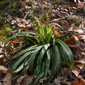 Most sedges are difficult to identify without examining the perigynia, but this woodland sedge is quite distinct. Only a few sedges have leaves this broad and this is the only one that is deep green without a waxy appearance to the leaves. The leaves also tend to have a crinkly appearance which can help distinguish it from C. careyana. Another common name, seersucker sedge, is a reference to the similarity of the leaves to the puckered surface of seersucker fabric.