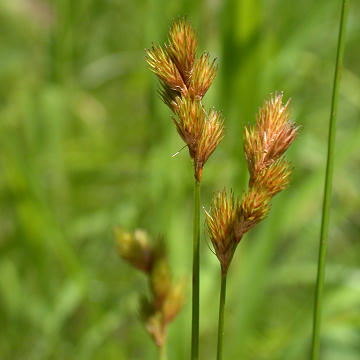 Tufted perennial to 70 cm, the lowest leaves reduced to scales (aphyllopodic); main leaves 1-3 mm wide, shorter than the stems; sheaths ventrally hyaline; spikes 3-8, ovoid to fusiform or subglobose, pale green to dull-stramineous or tan, sessile in an open or often condensed spike 2-4 cm; perigynia lanceolate, 4-5.5 mm x 1.5-2 mm, 2.5-3 times as long as wide, strongly flattened and much wider than the achene; achenes lenticular, narrow, mostly only 0.5-0.8 mm wide.
