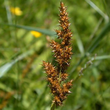 Stems to 1 m, stout, clustered, spongy, with 3-6 leaves, sharply angled and winged; leaves yellow-green, 5-10 mm wide, flat, margin scabrous; sheaths corrugate, ventrally thin, prolonged at the summit; inflorescence 1-3 x 3-10 cm; spikes numerous, androgynous, few-flowered, small, bracts thin and curved; scales short cuspidate, much shorter than perigynia; perigynia 4-6 mm long, greenish or somewhat stramineous, spongy-thickened at the base, gradually narrowing from the base to the tip, widely spreading; achene lenticular; stigmas 2.