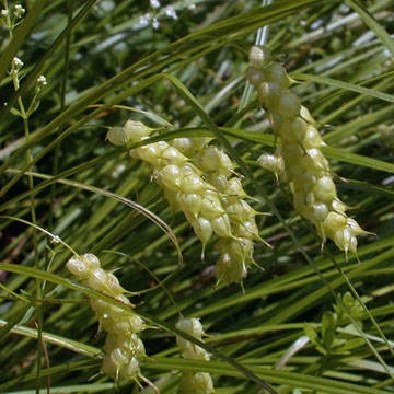 Similar to C. vesicaria but with wider perigynia and an achene that is deeply indented on one angle.