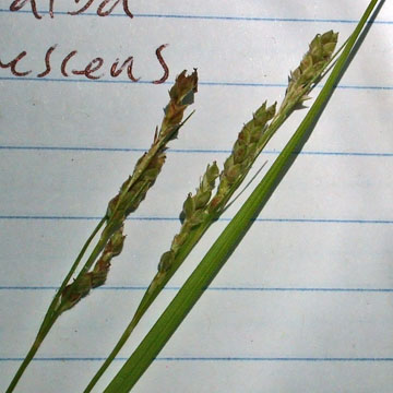 Tufted perennial; stems 50-100 cm, reddish purple at the base, usually overtopping the leaves; main leaves 2-4 mm wide, hairy; terminal spike 2-4 m, pistillate above; pistillate spikes 2-4, erect, 2-4 cm, linear-cylindric, loosely flowered at the base, sessile or short-peduncled; bracts sheathless or nearly so, the proximal foliaceous, the upper much reduced; anthers 1.5-2.5 mm; pistillate scales ovate, short than to surpassing the perigynia, hyaline-margined, with green midvein, acute to cuspidate; perigynia obscurely trigonous, more or less ellipsoid, 2-3 mm, densely hairy, conspicuously few-ribbed, acute, beakless; achene concavely trigonous..