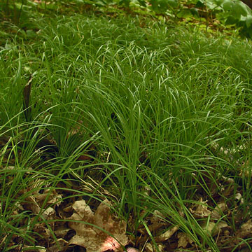 Carex meadii and C. tetanica are similar but typically not found in woodlands, are phyllopodic, have more slender, deeply-seated rhizomes, scarcely reddish leaf sheaths, and 3+ ranked perigynia overlapping throughout the spike.