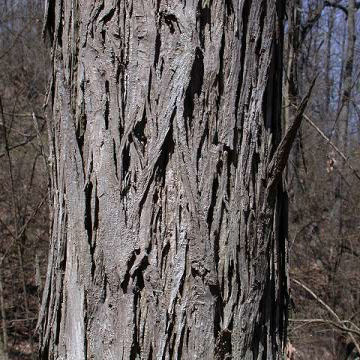 Deciduous tree to 25 m, rarely to 38 m. Bark gray, exfoliating is long plates (shaggy). Terminal buds more than 1.2 cm long; bud scales imbricate, gray. Leaves pinnate compound; leaflets 5, margins with persistent tufts of hair on one or both sides of the tooth, just below it's apex. Fruit with a thick husk, wider than long, solitary or in pairs; kernel sweet and tasty.