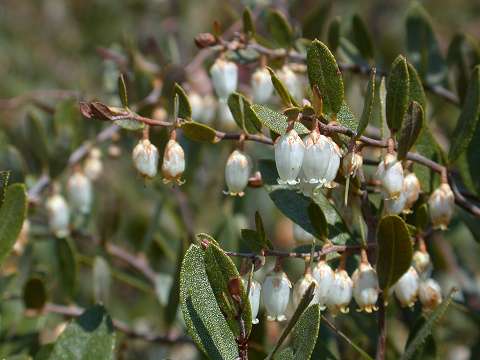 Multi-stemmed, evergreen shrub to 1.5 m. Leaves leathery, green, dotted with round scurfy scale, turning bronze with age. Flowers white, bell-shaped, in one sided racemes.