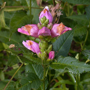 Herbaceous perennial to 70 cm. Leaves opposite, lanceolate or lance-oblong, serrate, acuminate, to 12 cm long, obtuse or broadly cuneate at the base; petiole 5-15 mm. Flowers in a terminal spike, purple to red-purple, with a white or yellowish beard; staminode white or whitish.