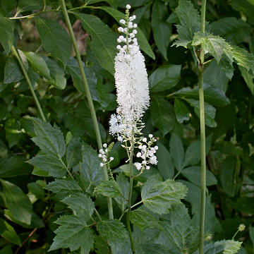 Herbaceous, poisonous perennial to 2.5 m. Leaves ternate and then pinnately single or doubly compound; leaflets rotund to oblong, coarsely and sharply toothed, mostly less than 10 cm long, cuneate to cordate at the base. Flowers foul-scented, in long, branched, slender racemes to 80 cm long; sepals petaloid, white, 5 mm; petals absent; stamens 8-10 mm; staminodes present, oblong or oblanceolate, 2-3mm; ovary usually 1, sessile; style stout; follicle firm-walled.