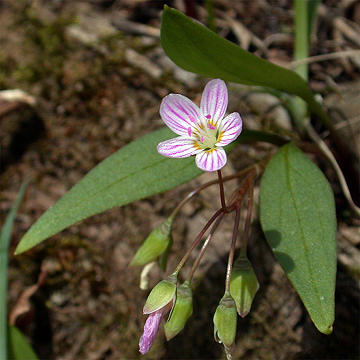 Low herbaceous plant from a rounded corm. Leaves opposite, mostly 3-6 cm long and 1.0-1.5 cm wide, diamond-shaped or lance-ovate, acute at the base with a distinct petiole. Flowers with 5 petals, white to pink with deeper pink stripes. Sepals 2, surrounding a small fruiting capsule at maturity.