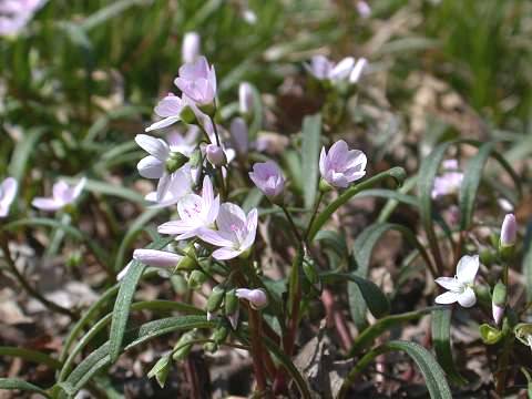 Low herbaceous plant from a rounded corm. Leaves 2-8" long, narrow, opposite in a single pair midway up stem. Flowers with 5 petals, white to pink with deeper pink stripes. Sepals 2, surrounding a small fruiting capsule at maturity.