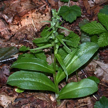 Herbaceous perennial with fleshy, forked roots that are renewed annually; stems stout or slender, 20-50 cm; lowest 1-2 leaves reduced to bladeless sheaths; main foliage leaves three or more, obovate to oblanceolate; 5-12 cm, up to 5 cm wide, the upper gradually reduced and passing into bracts; inflorescence 5-20 cm; bracts lanceolate, foliaceous, the lower surpassing the flowers; flowers greenish, often tinged with purple; lip 6-10 mm, the margins upcurved at the base, the body obcuneately widened distally, terminating in three teeth, the central one the shortest; lateral petals lanceolate, nearly concealed by the incurved sepals; spur 2-3 mm, pouch-like, with a minute orifice.
