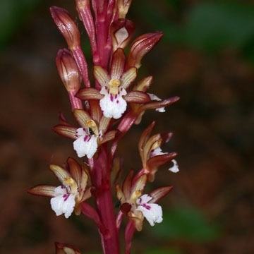 Mycoheterotrophic perennial; stem 20-60 cm, often pink-purple; inflorescence 5-15 cm; flowers 10-40; sepals and lateral petal narrowly oblong to oblanceolate, 6-8 mm, 3(5)-nerved, the lateral sepals somewhat divergent, the lateral petals typically spotted or suffused with purple; spur a prominent, sometimes divergent swelling near the tip of the ovary; lip 6-8 mm, white, usually purple-spotted, with two small but evident lateral lobes below the middle and two short parallel ridges on the face, its terminal lobe rounded and deflexed, 3-4 mm wide.