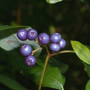 Deciduous, multi-stemmed, solitary shrub to 3 m or more; twigs of current year's growth densely puberulent; young twigs often reddish; older twigs streaked with gray; pith of second-year twigs chocolate-brown. Leaves smooth, opposite, oblong, acuminate, deep green above, pale below. Flowers small, in open cymes. Fruits blue, sometimes whitish, produced in late summer.