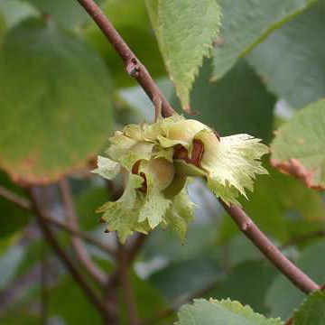 The female flowers, though extremely small, are a beautiful ruby red. The nuts are rather small but similar in flavor to commercial filberts. Dirr suggests that the species is too large a shrub for contemporary landscapes, although I find it makes a nice hedge. The foliage is dense, deep green in summer and fall color can be good yellow-bronze.