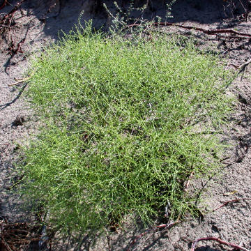 Densely branched, annual tumbleweed. Leaves hairy, soon deciduous, lanceolate, coarsely and irregularly toothed, up to 8 cm near the base, progressively reduced upward. Flowers minute, green, perfect or merely pistillate, in spikes 2-6 cm, sessile; sepals 5, calyx 3-4 cm wide, eventually forming a membranous wing below the lobes; ovary flattened, globose; styles filiform. Fruit plano-convex, horizontal, purple or black with a free pericarp.