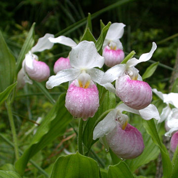 Herbaceous perennial; stem leafy, 40-100 cm, hirsute; leaves elliptic-oval, 10-20 cm long and about half as wide, clasping, plicate, hairy; flowers 1-3; sepals white, round-oval, obtuse, the lower two connate for their entire length; lateral petals white, flat, oblong, nearly as long as the sepals but much narrower; lip 3-4 cm, white or pinkish, irregularly streaked with rose or purple outside and marked with purple spots inside (rarely completely white).