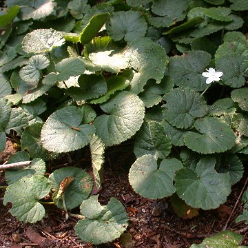 Creeping perennial with slender stems. Leaves simple, cordate, sparsely hairy, to 5 cm; petioles downy. Flowers solitary, of two types; petaliferous flowers white and usually sterile, on long peduncles 5-10 cm long; apetalous flowers self-pollinating, on peduncles less than 5 cm and often recurved. Fruit a 1-seeded drupe, to 4 mm, that resembles an achene.