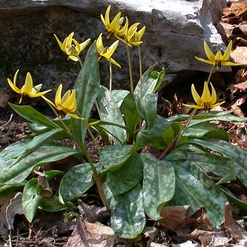 Often found in sizable colonies. The mottled pattern on the leaves is said to resemble that of a trout, hence the name 'trout lily'. Of the approximately 30 species of Erythronium, most occur in North America. One occurs in Europe and at least 3 occur in Japan. E. japonicum has particularly showy blue-violet flowers.