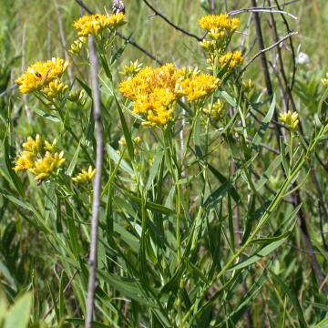 The genus Euthamia segregates some of the flat-topped goldenrods from Solidago. The typical variety, pictured here, is mostly glabrous. Plants that are evidently spreading-hirtellous have been called var. nutallii (Green) Fern.