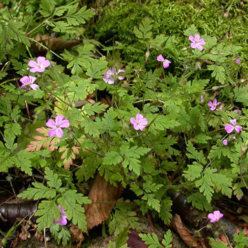 Annual or biennial. Leaves with 3-5 divisions, deeply pinnatifid to pinnately lobed, the divisions complete, green to red. Stems hairy, reddish. Flowers pink striped with white, 1/2" wide, petals 5, born in pairs from the axils of leaves. Fruit a beaked capsule.