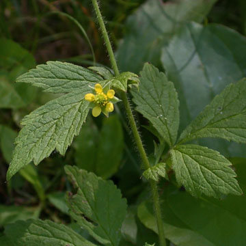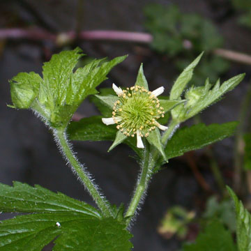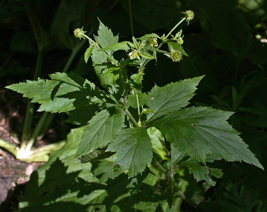 Herbaceous perennial; stem 40-100 cm, hirsute; lower leaves long-petioled, pinnately compound, the segments pinnately lobed and incised; upper leaves trifoliate with cuneate-obovate segments, or merely 3-lobed; pedicels minutely puberulent and densely hirsute, the hairs commonly 1-1.5 mm long; sepals triangular, 4-10 mm; petals white, 3.5-mm, distinctly shorter than the sepals; head of achenes subglobose, 12-18 mm; receptacle glabrous or with a few short bristles; achenes 3-5 mm (excluding style), glabrous (var. laciniatum) or sparsely hairy (var. trichocarpum).